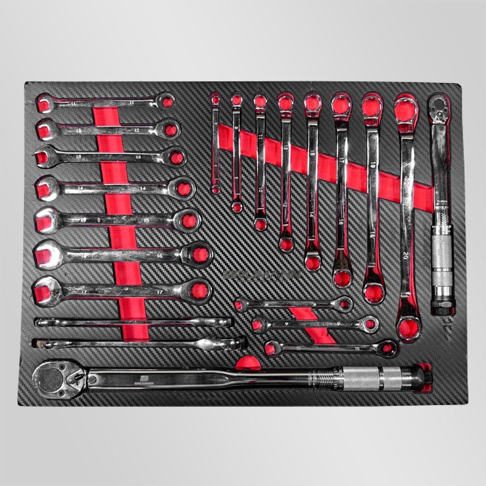 - 3e tiroir : Lot de clés plates de 8 à 22mm à œil cliquet + clé dynamométrique 1/2″ (40/210Nm) et 1/4″ (5/25Nm).