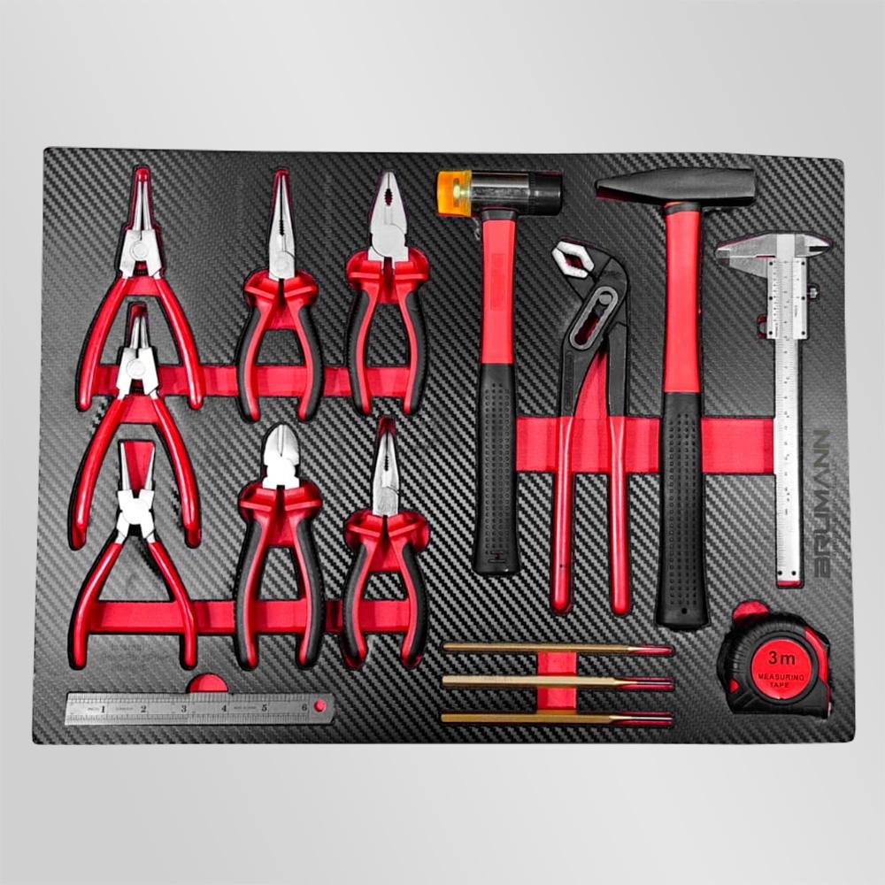 - 6e tiroir : Assortiment de pinces, pince à circlips, marteau, maillet, pied à coulisse, réglet.